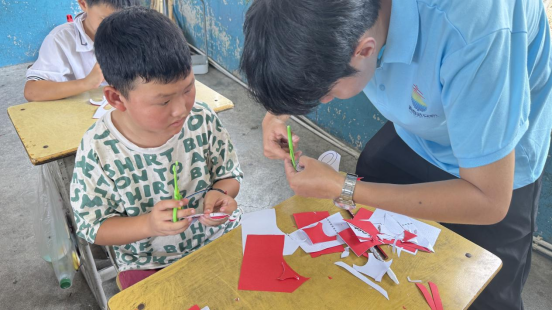 “现在轮到你们自己动手剪啦!”褚甜靖刚举起一摞彩纸,教室里就像炸开了一窝小麻雀,孩子们争先恐后地找志愿者拿工具。李紫嫣踮着脚尖从后排挤过来:“老师,我要红色的!”她把彩纸按在桌上折了三折,食指在边缘压出深深的折痕,剪刀尖像小蛇似的游过纸面。展开的瞬间,一朵六角形的窗花呈现在眼前,六只蝴蝶的翅膀仿佛还在微微颤动。