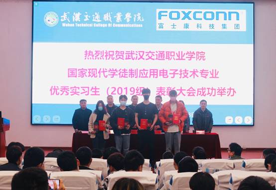 为表彰优秀实习学生,树立爱岗敬业、知行合一的学生模范,3月18日下午,电子与信息工程学院携校企合作单位富士康(武汉)科技工业园举办了国家现代学徒制应用电子技术专业实习优秀生表彰大会。学院院长胡迎九、党总支书记徐静、副院长施亚齐、沈卫文富士康(武汉)科技工业园代表人力资源部部长董永、课长方海军及富士康学徒制班级职业导师、辅导员老师参加了此次大会。大会由施亚齐主持。