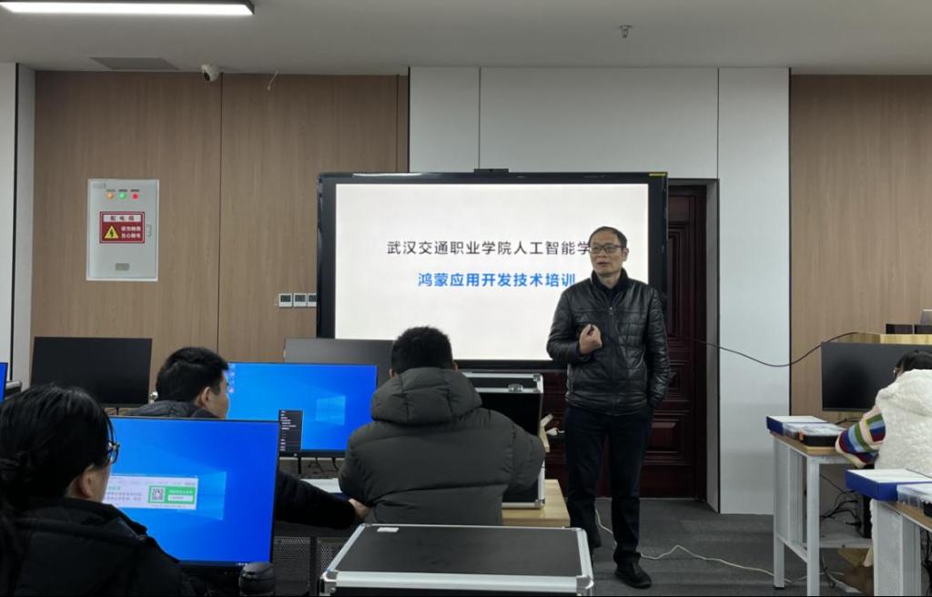(通讯员:熊卜杰)1月30日,人工智能学院在尚能楼鸿蒙实训室举办鸿蒙应用开发技术专项培训。本次培训特邀武汉造风者教育科技有限公司研发经理向银刚担任主讲,学院全体专业教师参加学习。此次培训旨在帮助教师掌握鸿蒙南北向开发与昇腾AI集成等核心技术,进而推动学生实现从基础认知到综合创新的阶梯式能力提升,增强其在物联网与人工智能交叉领域的实践竞争力。