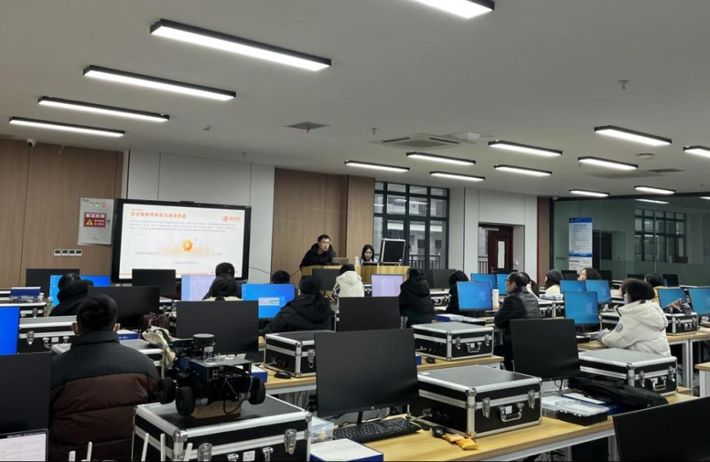 培训聚焦鸿蒙综合实训室的教学资源整合与实际应用。向银刚经理系统介绍了实训室教学体系的构建与资源贯通路径,重点讲解了鸿蒙南向与北向设备开发技术,并演示了从仿真环境到机器人视觉实现的智能小车项目。培训采用“理论讲解+实操演练+小组研讨”相结合的模式,注重教师动手能力与协作教学的培养。在智能小车自主运行展示环节,教师们纷纷驻足观摩,交流互动频繁,现场学习氛围浓厚。
